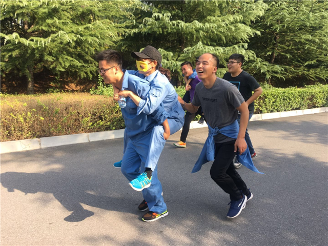 每一小团队在折返点领取比赛号码后按照原路返回,在离终点100米处其中一名队员脱掉一只鞋充当成伤员,另一名队员当盲人,团队采用抬、扶、背的方式把两名伤员一起带回终点。在趣味活动中,职工还实践了救助技能,活动意义更加深刻,顺利抵达终点后,大家都收获了成功的喜悦。